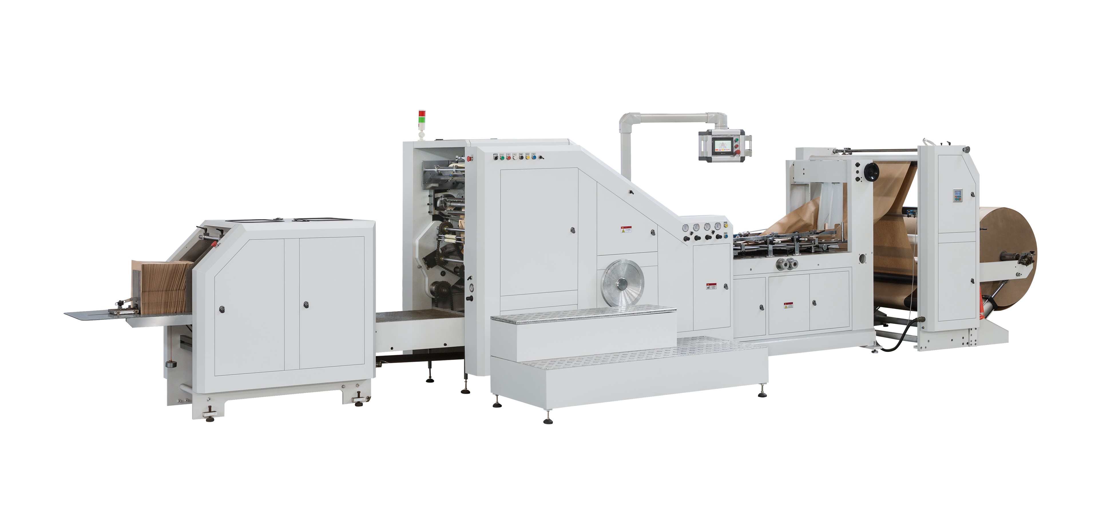 Double sheet feeding paper bag making machine, albe to work by separate moduls or fully automatic line.